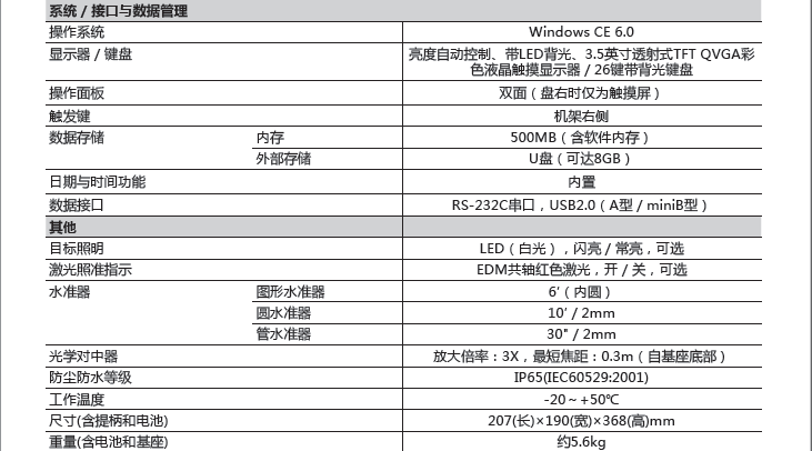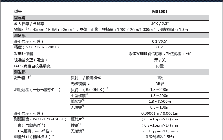 符合《測繪資質分級標準規定(2014版)》中“大地測量”及“工程測量”甲級認證標準對高精度全站儀的要求。